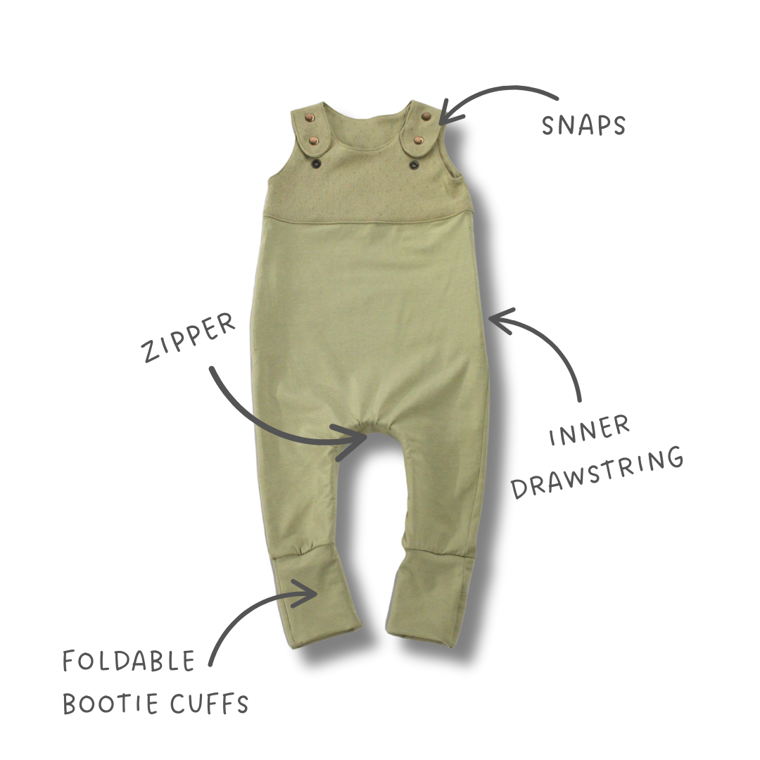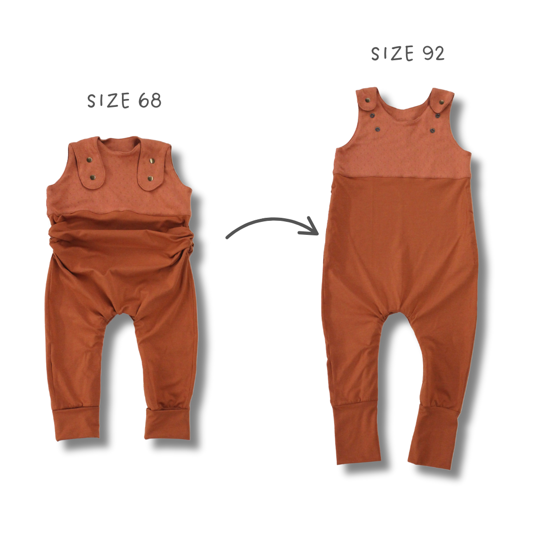 Our grow-with-me overall stretches and adapts as your little one grows — from size 68 to 92.